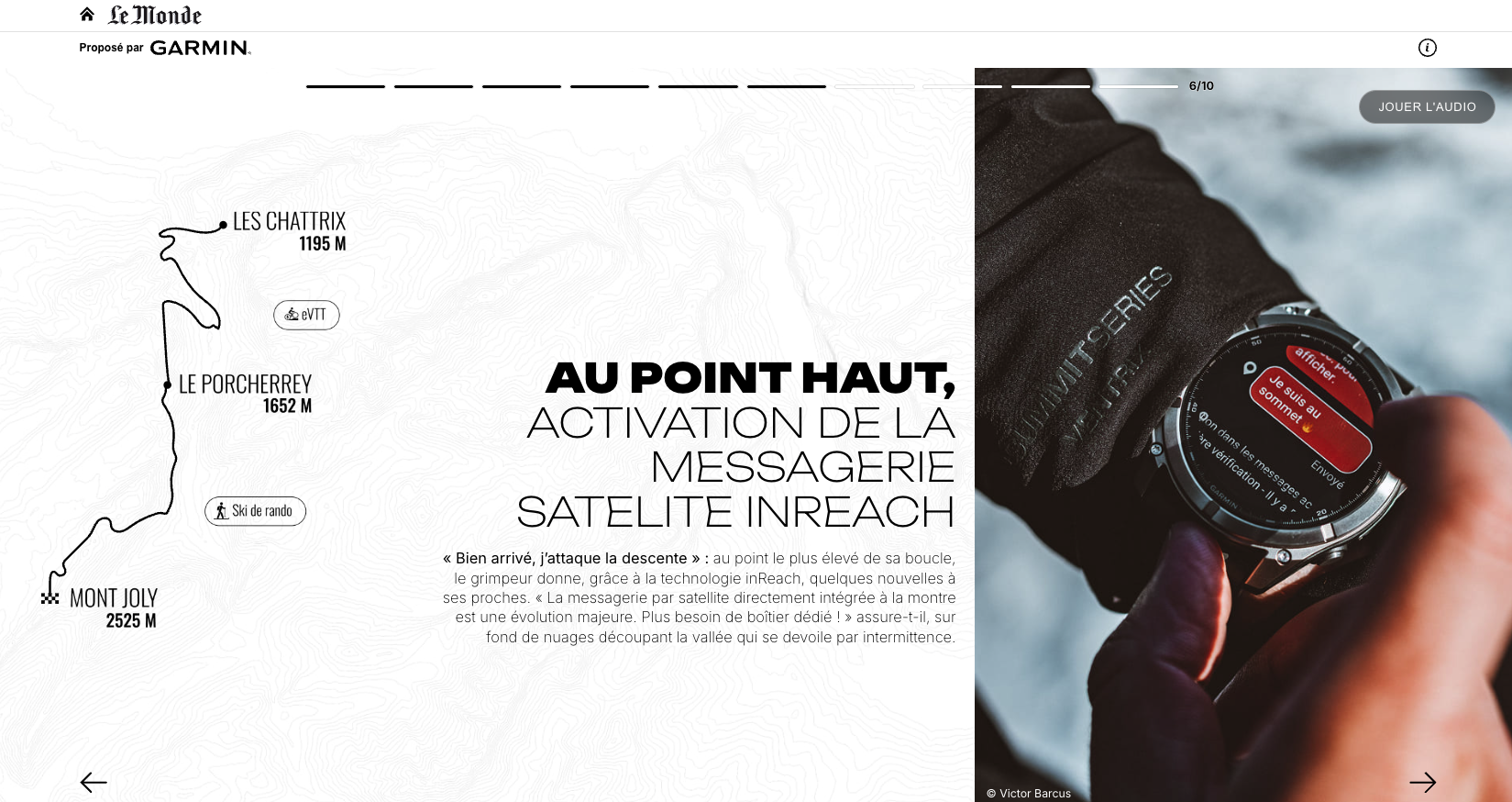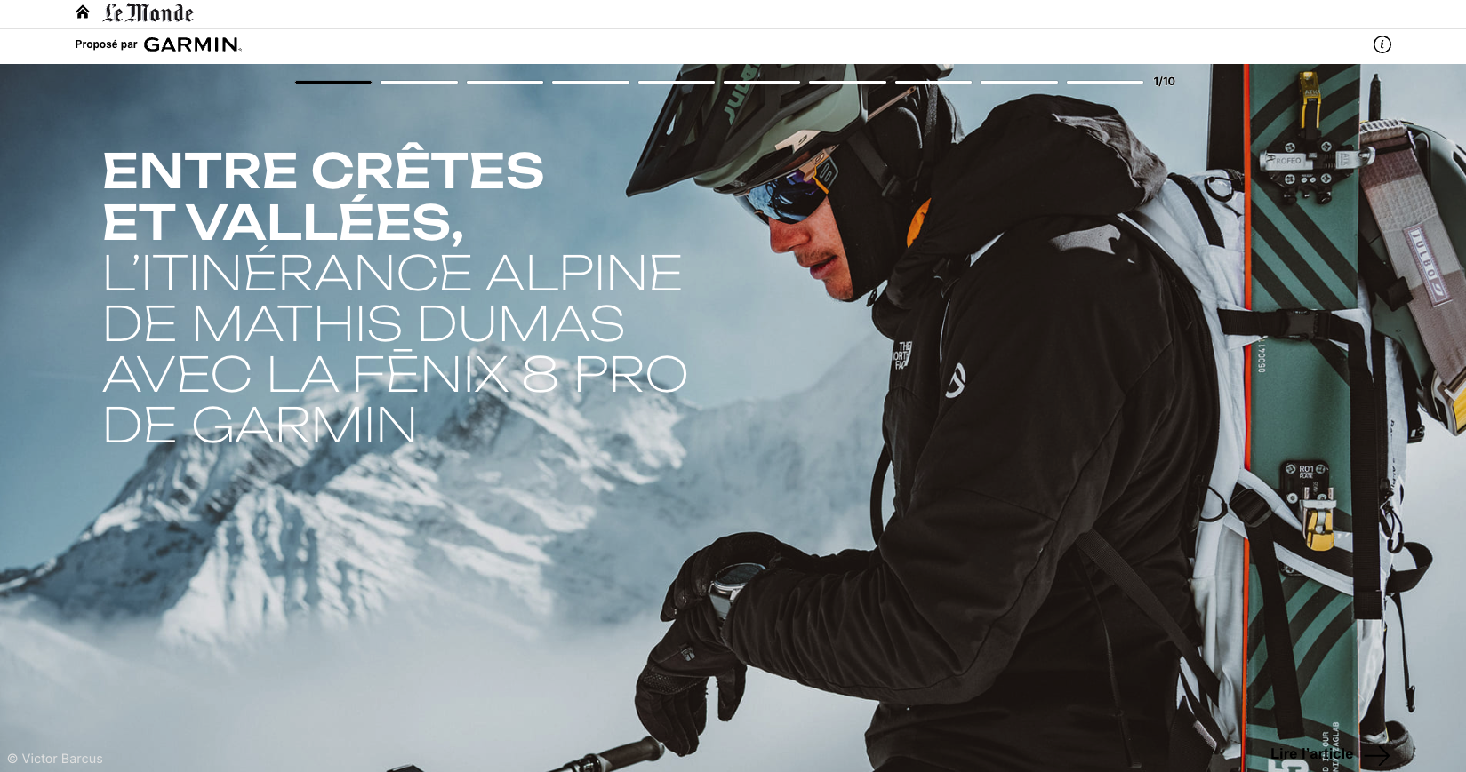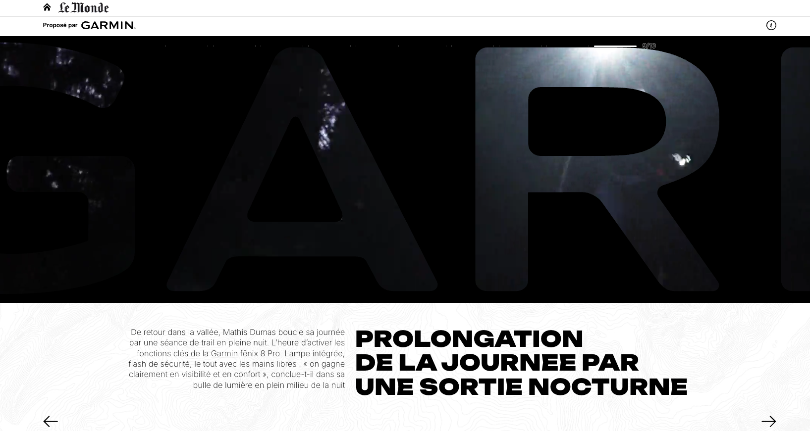 Rédaction d’un article immersif au format caroussel publié sur le site web du journal Le Monde pour la marque Garmin. En collaboration avec M Publicité.
