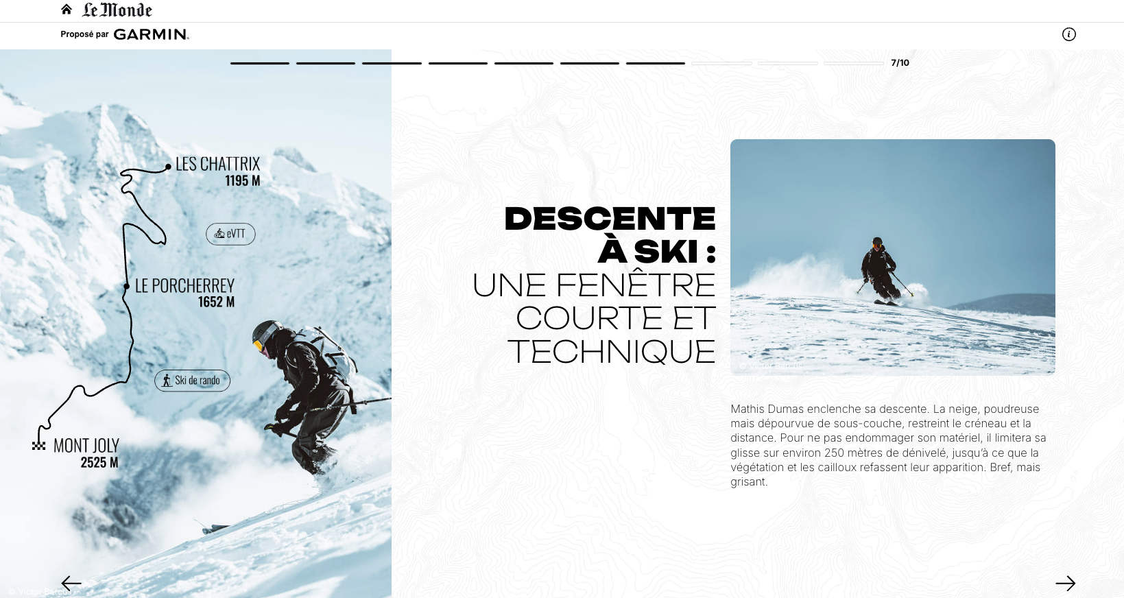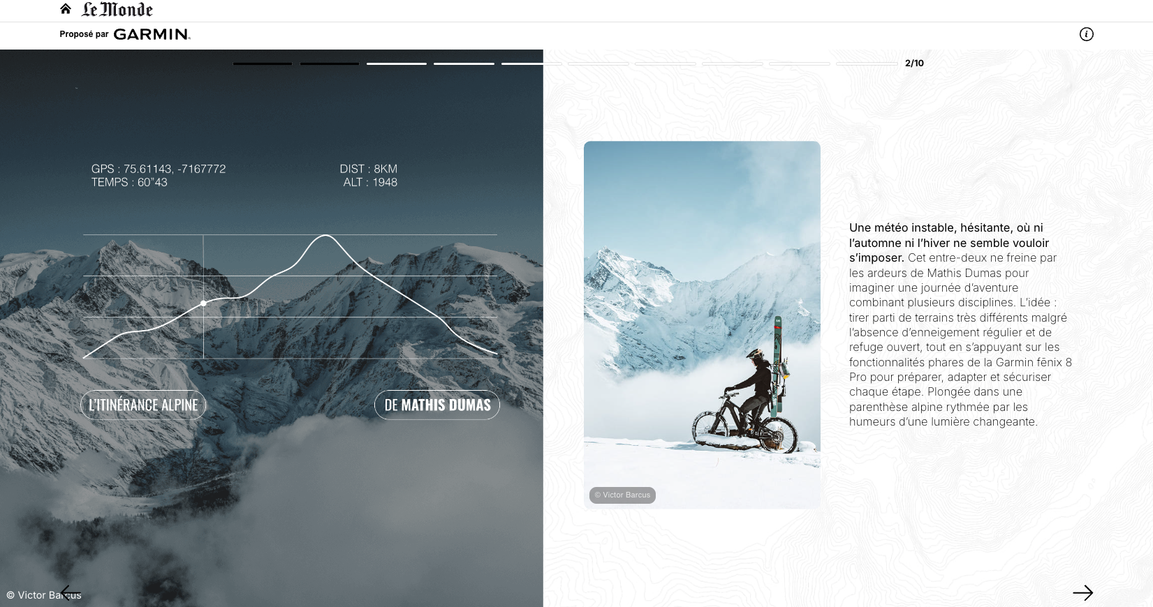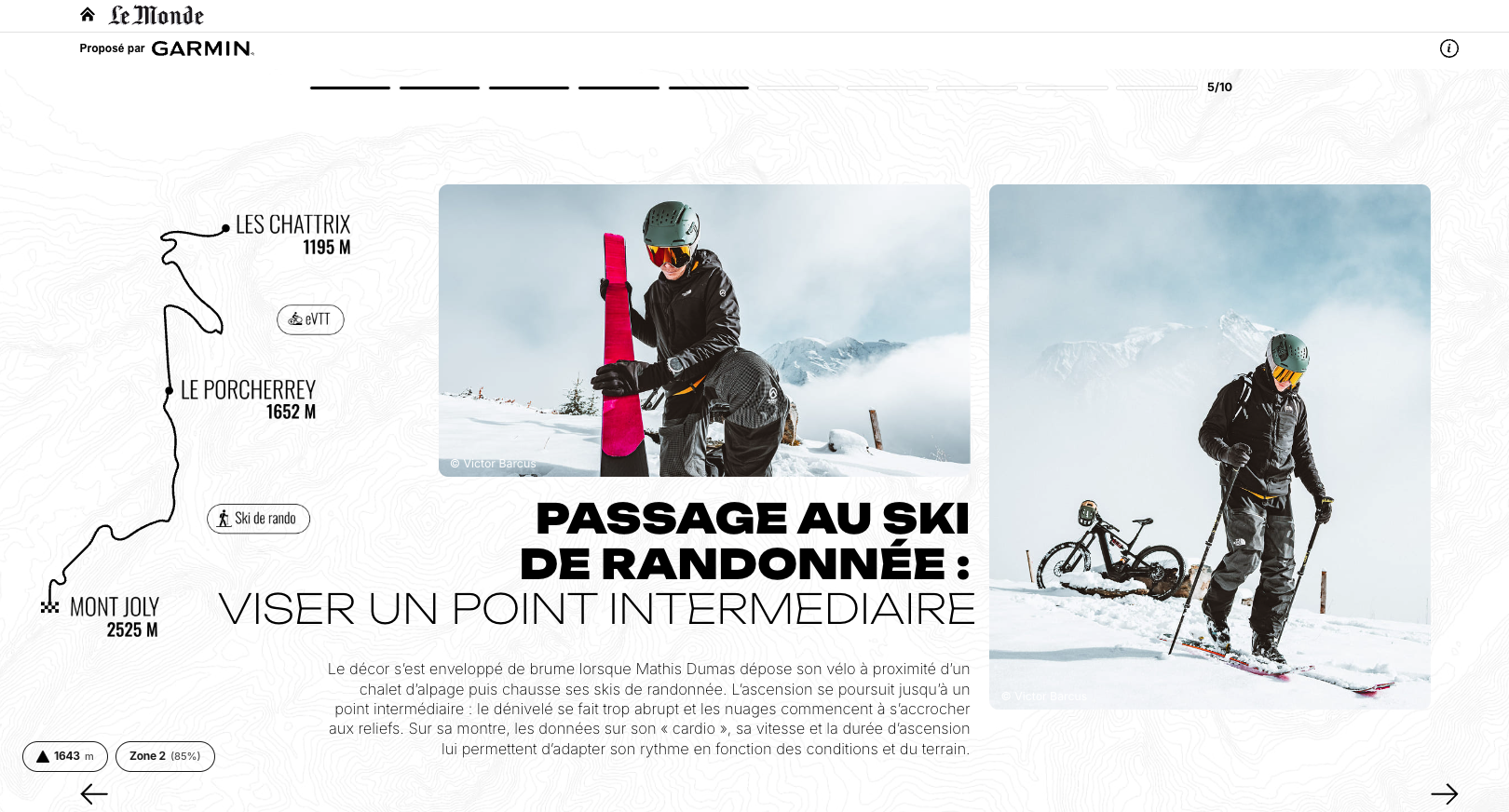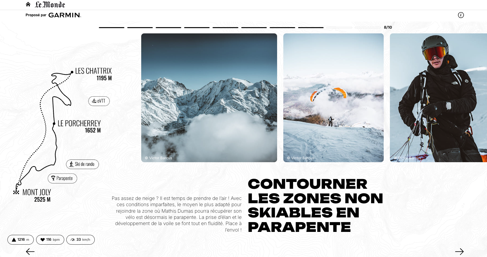 Rédaction d’un article immersif au format caroussel publié sur le site web du journal Le Monde pour la marque Garmin. En collaboration avec M Publicité.